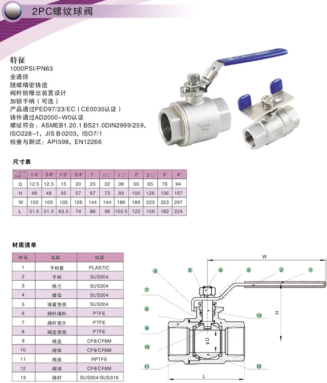 2PC螺紋球閥簡單描述:全通徑,雙內(nèi)牙設(shè)計,脫蠟精密鑄造閥體,設(shè)有閥桿防爆出裝置,主要用于截斷或接通管路中的介質(zhì),結(jié)構(gòu)緊湊,密封可靠,結(jié)構(gòu)簡單,維修方便,經(jīng)濟(jì)實惠,易于操作和維修
